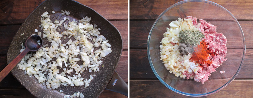 3. Обжарить лук с грибами на сковороде на небольшом количестве растительного масла.