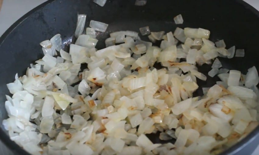 Сразу же можете поместить в кастрюльку рис, залить его водой (1:3) и поставить на небольшой огонь, чтобы потихоньку варилась рисовая часть начинки. На соседнюю конфорку поставьте сковороду с растительным маслом, и пока оно нагревается, нарежьте очищенный лук кубиками. Переложите кусочки лука в сковороду и обжаривайте до прозрачности, время от времени помешивая.