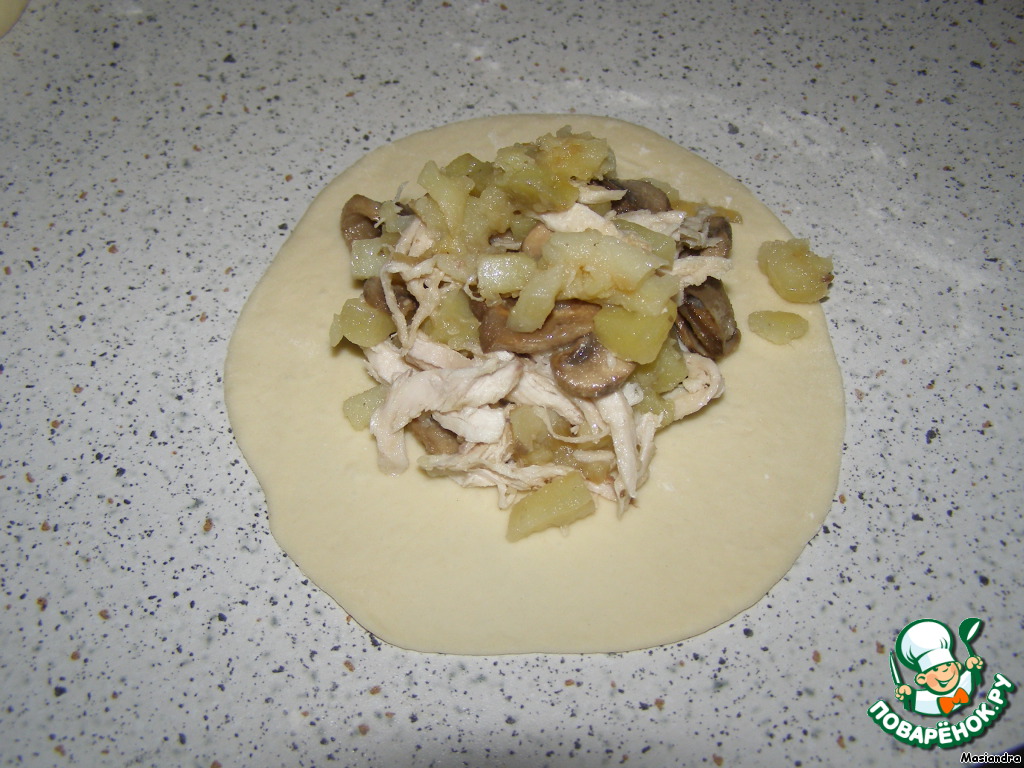 шарик раскатывайте в лепёшку. В центр выложите начинку и залепите края в