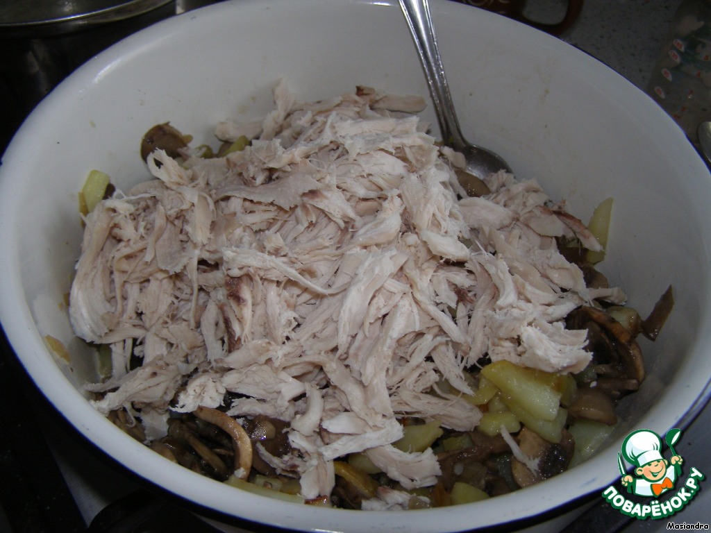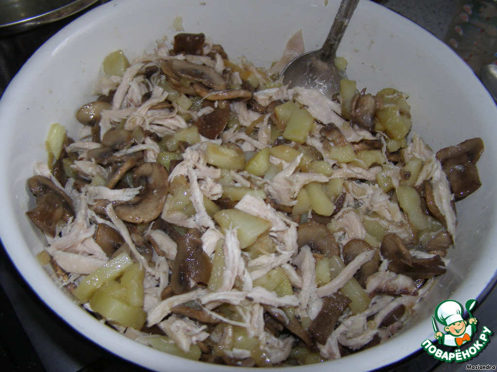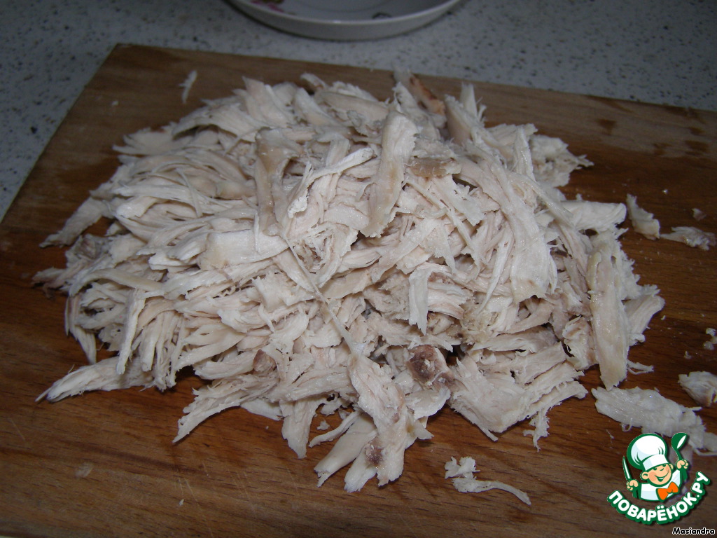 Основа начинки в данном рецепте это нарубленное ножом белое мясо курицы.