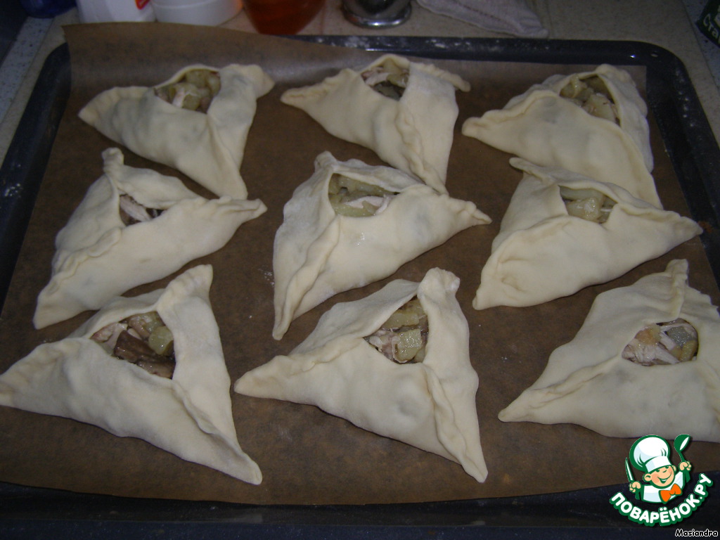 Кладем начинку по центру и залепляем эчпочмаки в виде треугольника. Готовые изделия укладываем на противень, который смазан растительным маслом. Нагреваем духовку до 180 градусов и выпекаем татарские пироги в течение 30 минут.