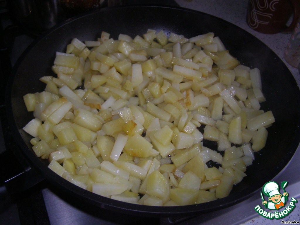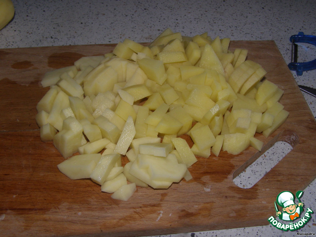 картошку и лук нашинкуйте на кубики одинакового размера. Посолите смесь. - От
