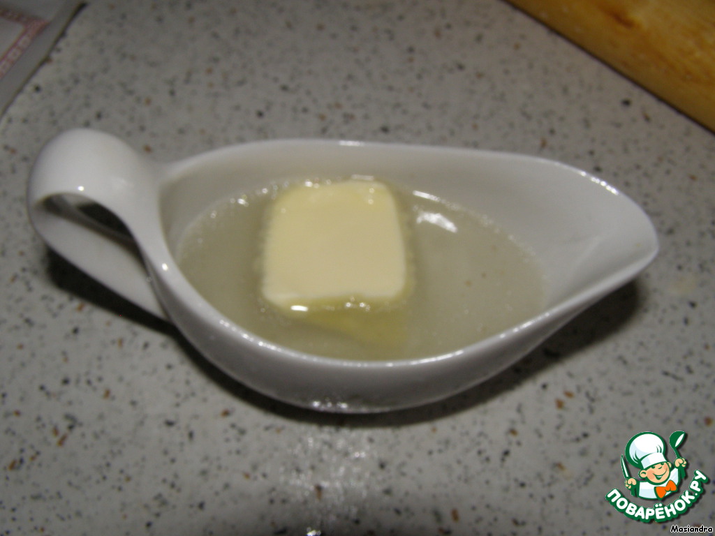 Займёмся приготовлением теста. Сливочное масло растапливаем, выливаем в миску и даём понизить температуру – но не застыть.