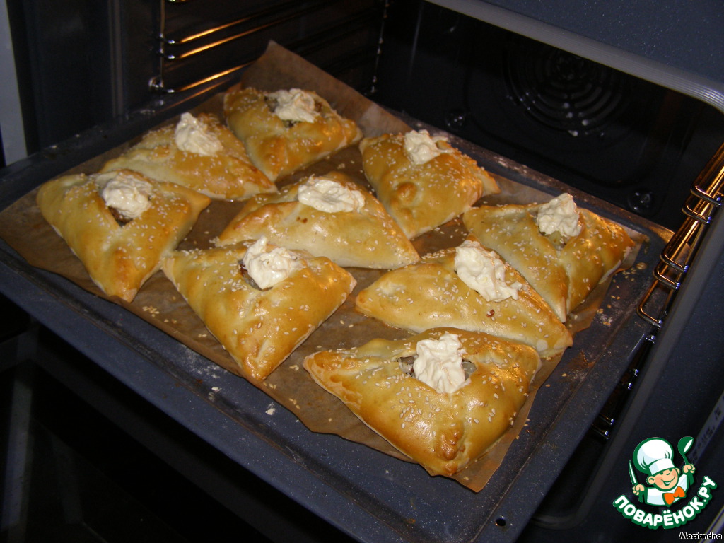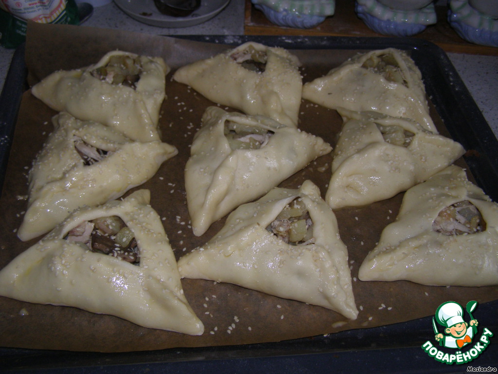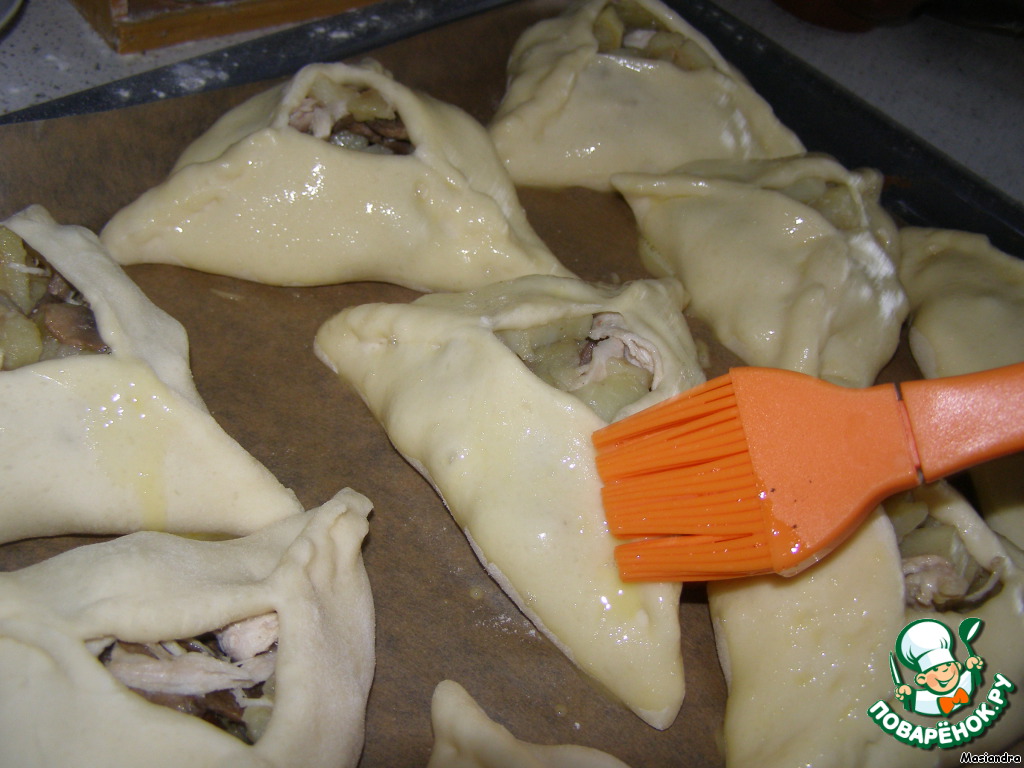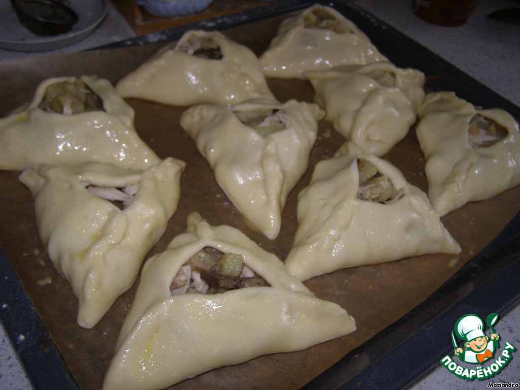 Все треугольники раскладываем на противне и смазываем смесью масла сливочного с яйцом. Смесь готовится из расплавленного и остывшего масла и яйца, посредством взбалтывания вилкой.