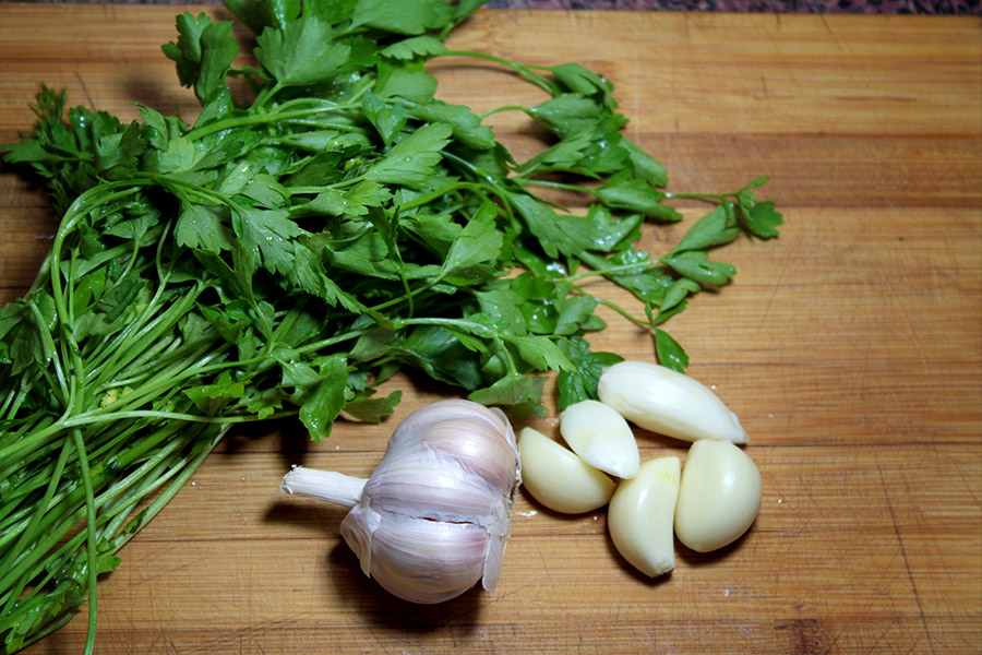 Для приготовления говяжьего края с соусом из чеснока и петрушки вам понадобится 700 грамм мяса, чеснок, лисья петрушки, белый винный уксус, соль, перец, оливковое масло.