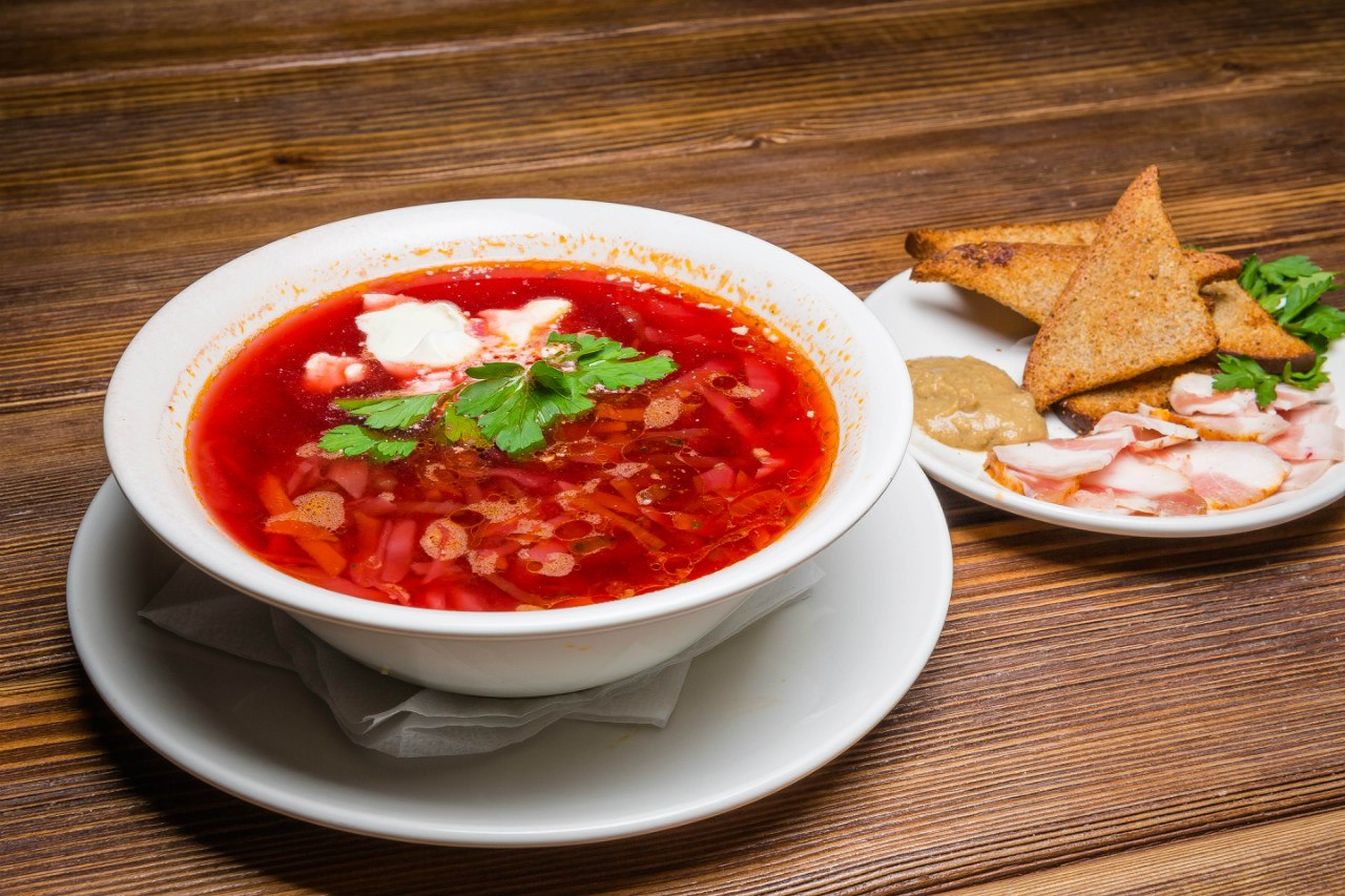 В классическом варианте при подаче борща к столу добавить ложку домашней сметаны и веточку петрушки, а рядом положить кусочек хлеба с салом. Приятного аппетита!