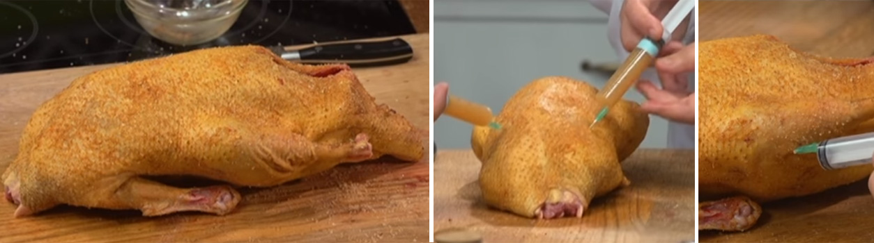 - С помощью 20-ти кубового шприца шпигуем гуся яблочным соком. Делаем 4 инъекции в грудку (по 20 мл. под углом 45 градусов. Будьте осторожны, чтоб не сломать игру о кость) и 2 укола в каждую ножку. Всего 8 уколов.
