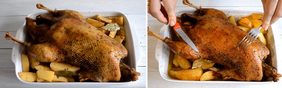 Например, Александр Ильин рекомендует сначала разогреть духовку до максимума, установить решётку на противень с высокими бортами и налить в противень воду слоем около сантиметра. На решётку уложите гуся грудкой вниз, поставьте в духовку и оставьте на 15 минут. Затем уменьшите температуру до 150-160°С, аккуратно переверните гуся на спинку и запекайте примерно 1,5-2 часа, в зависимости от размера. Периодически поливайте гуся жидкостью из противня. Готовность гуся определяется прокалыванием спицей в толстом месте ножки: если вытекающий сок прозрачный, то гусь готов. На случай излишнего зарумянивания приготовьте лист фольги и накройте гуся этим листом, если он начнёт подгорать.