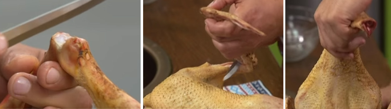 - необходимо отрезать лапки, достать из тушки внутренности и срезать лишний жир. Жир выбрасывать не нужно, на нем можно потом поджарить картошку.