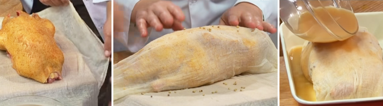 Смочите 2 метра марли в оставшемся соке и оберните тушку этой марлей. Между слоями марли положите специи, например, кориандр или душистый перец горошком. Отправляем гуся мариноваться в холодильник минимум на 3 часа.