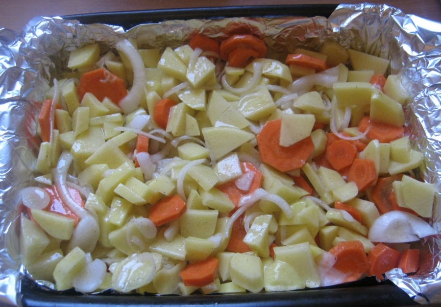 Морковь очистите, нарежьте крупными колечками, лук нашинкуйте полукольцами. Мытый картофель очистите от кожуры, порежьте кубиками. Подготовленные овощи выложите в глубокую форму для запекания, застеленную фольгой.