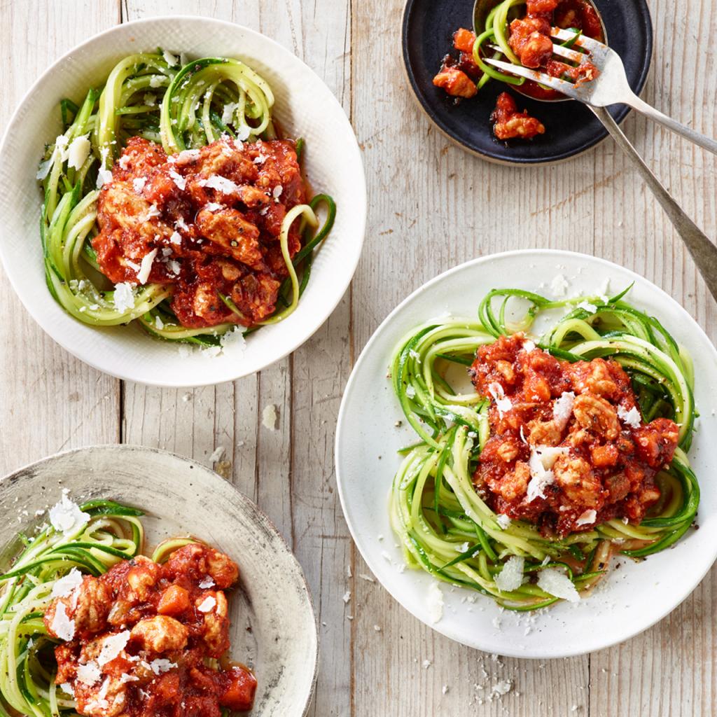 Разложите лапшу из кабачков по порционным тарелкам. Сверху положите тушеную индейку с баклажанами и подавайте блюдо с натертым сыром «Пармезан».