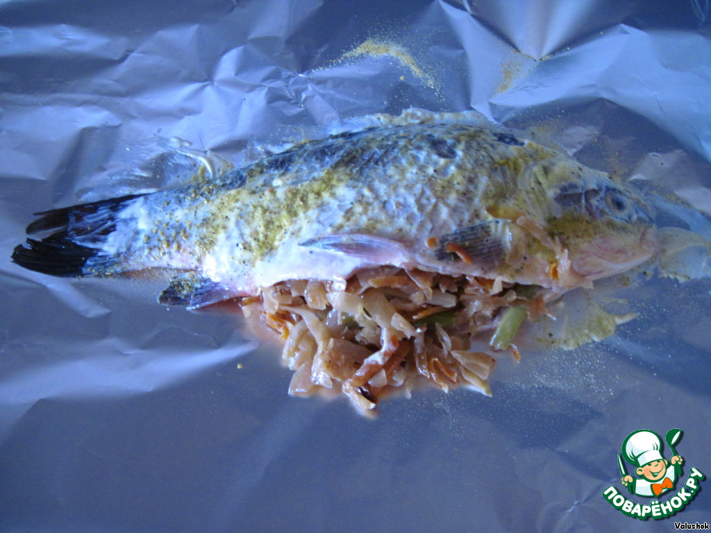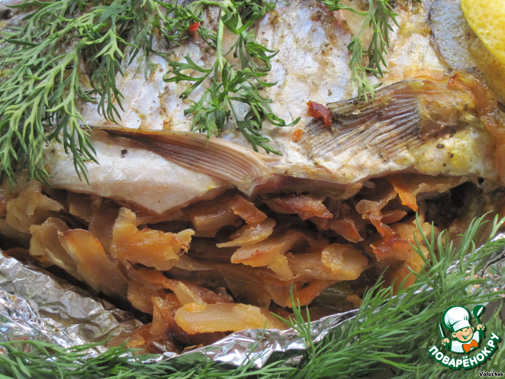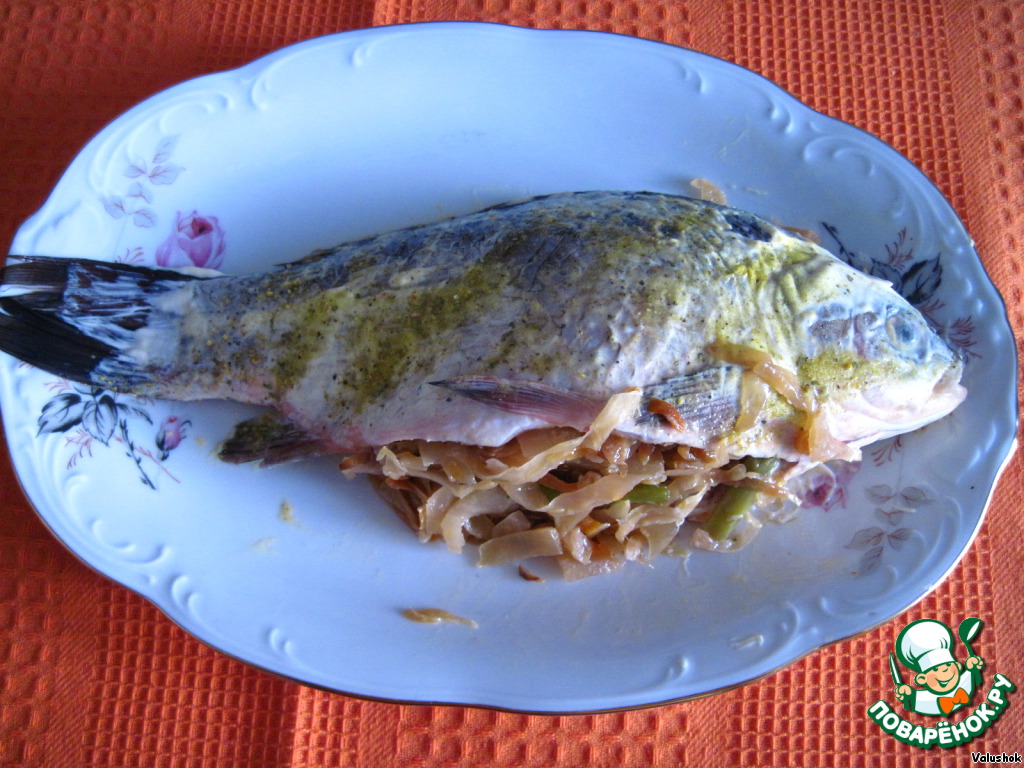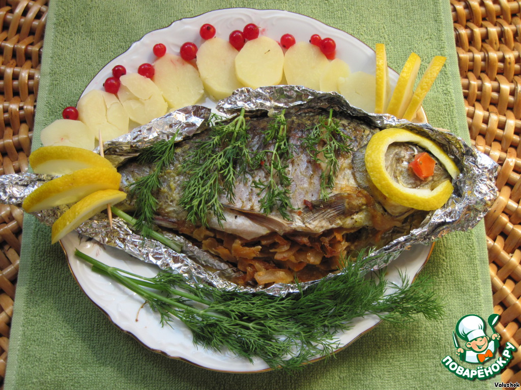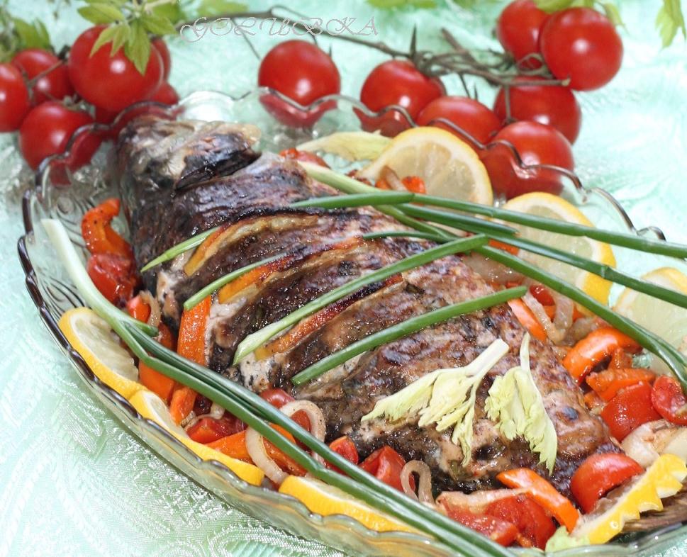 Карп, фаршированный овощами, запеченный в духовке с луком