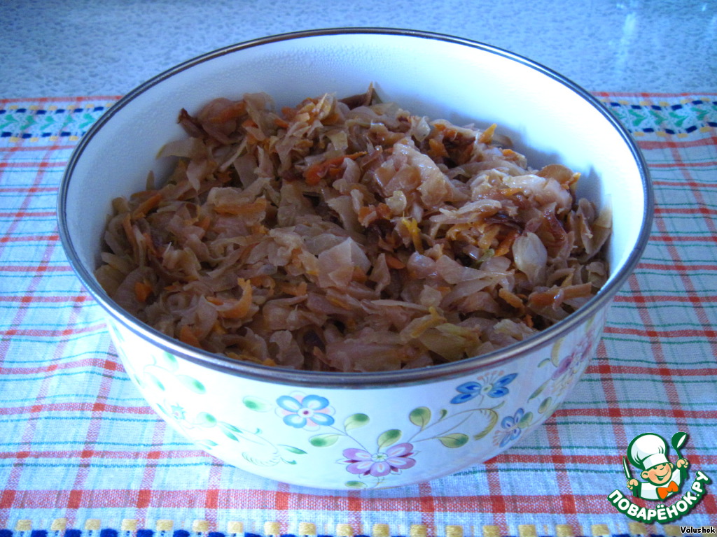 Начинку сделать заранее. Потушить свежую капусту до полуготовности, добавить квашенную капусту и отдельно обжаренные лук с грибами, добавить соевый соус и потушить еще 10-15 минут.