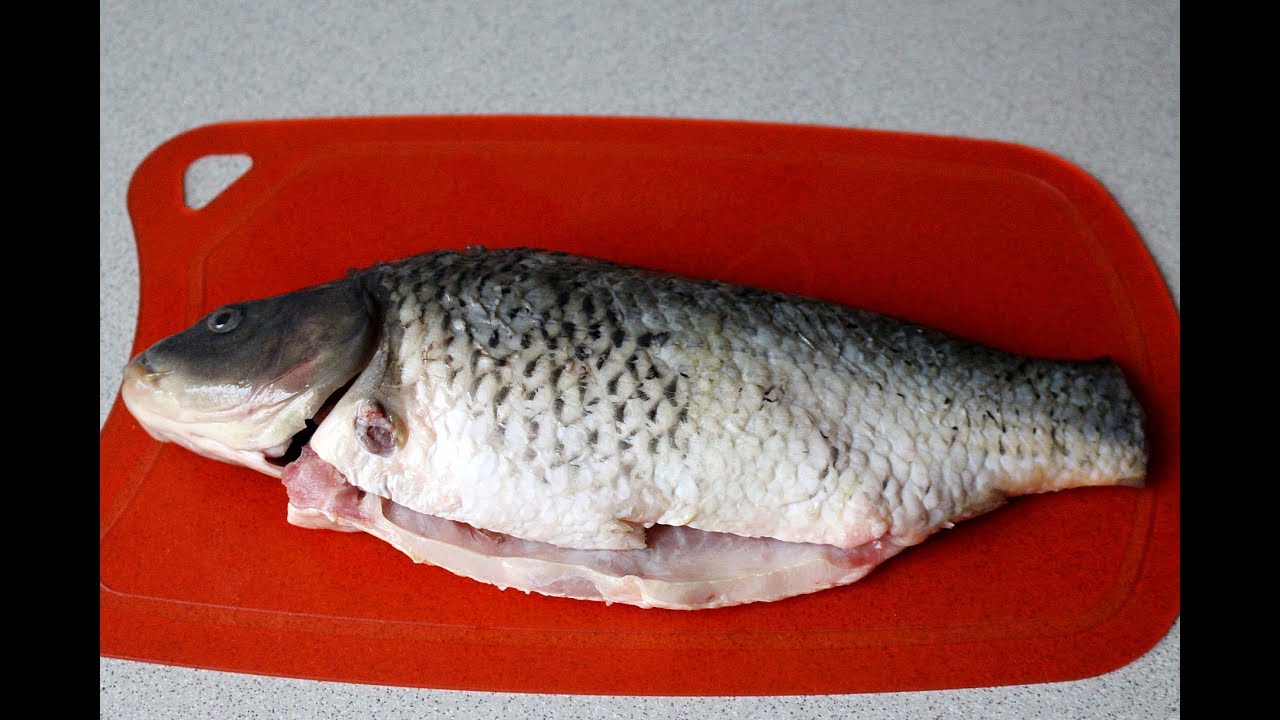 - Выпотрошить карпа, отрезать хвост и плавники, убрать жабры и глаза. Поскоблить чешую.