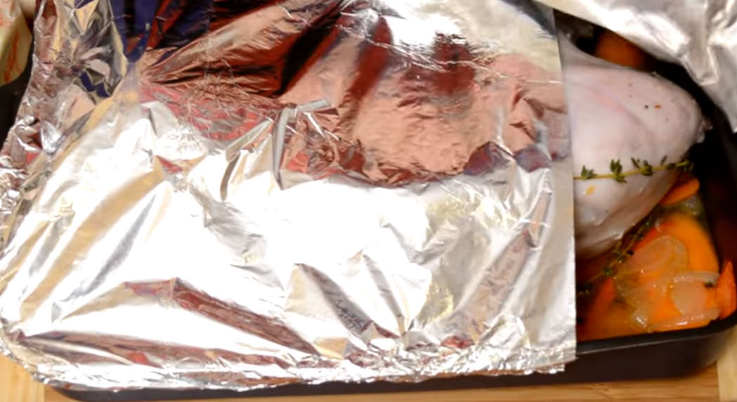 - Заворачиваем противень в фольгу очень плотно, чтобы пар от кролика оставался внутри пакета.