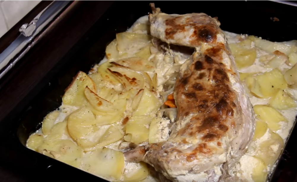 Вновь достают противень, заливают кролика и картошку сметанкой и снова отправляют в печь на 10 минут.