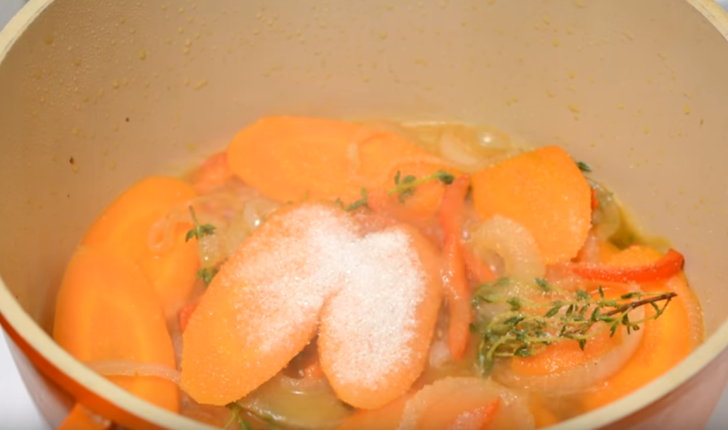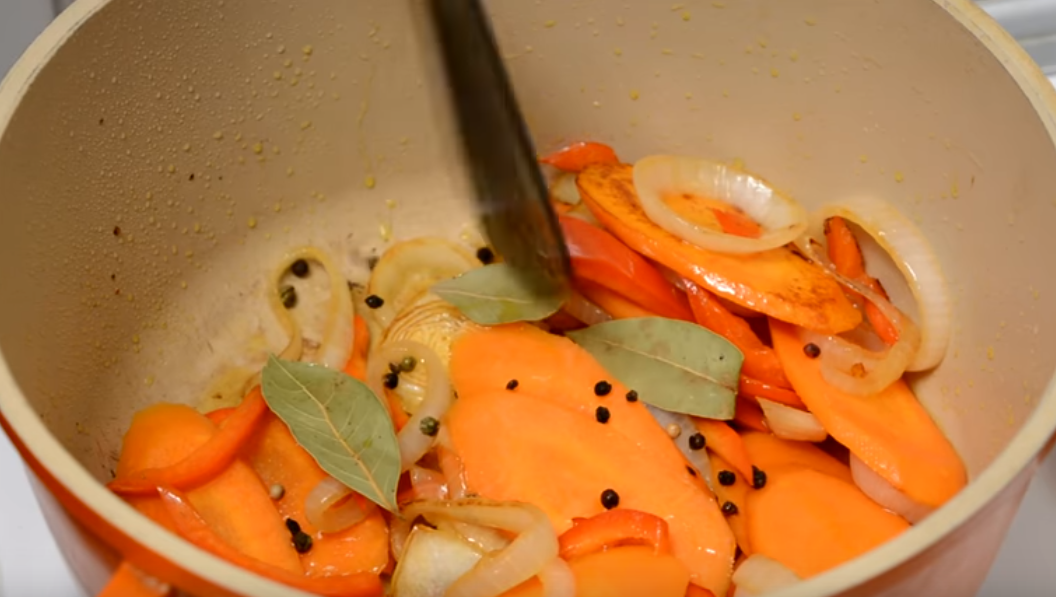 - Добавляют в кастрюлю поджарку из лука и моркови, приправляют яство по вкусу, готовят еще 10 минут.
