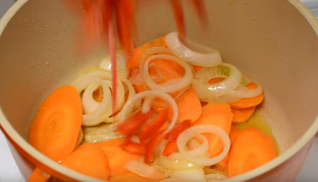 Теперь, нам нужно обжарить овощи, я беру лук и морковь, можно сельдерей. Нарезаю крупно, обжариваю, но не до золотистого, лук, и морковь.