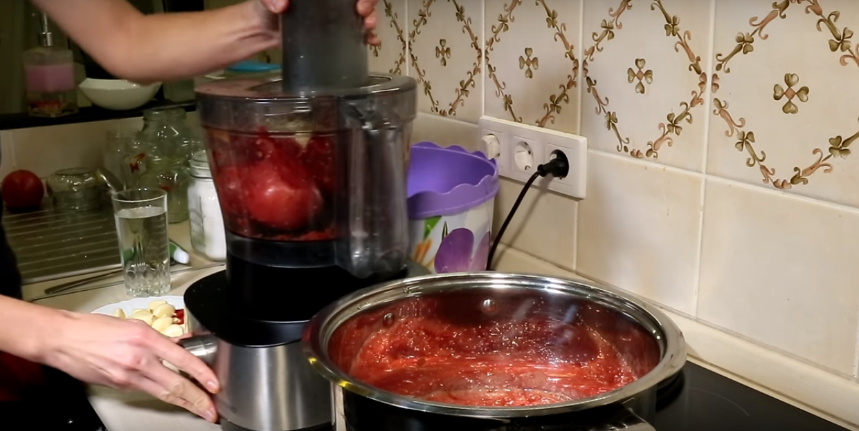 Болгарский перец, жгучий перец, помидоры и чеснок измельчаем в кухонном комбайне или пропускаем через мясорубку. Готовую смесь выливаем в кастрюлю.