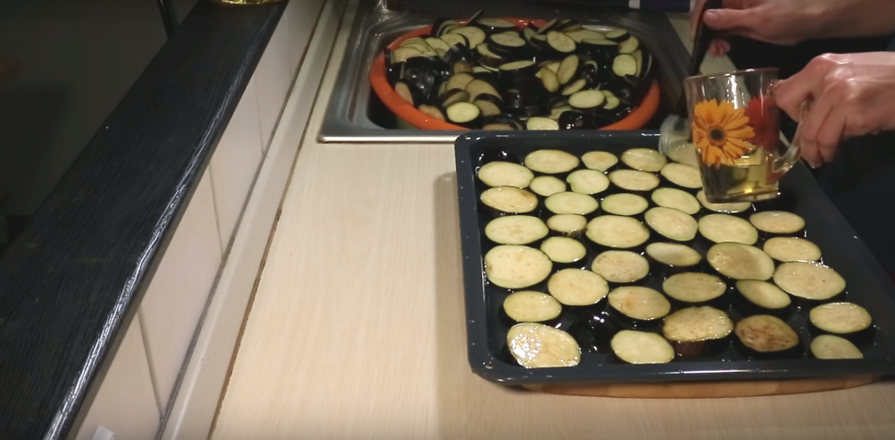 Баклажаны нарезаем кружочками толщиной в 0,5- 1 см и выкладываем в один слой на противень, обильно смазанный растительным маслом.