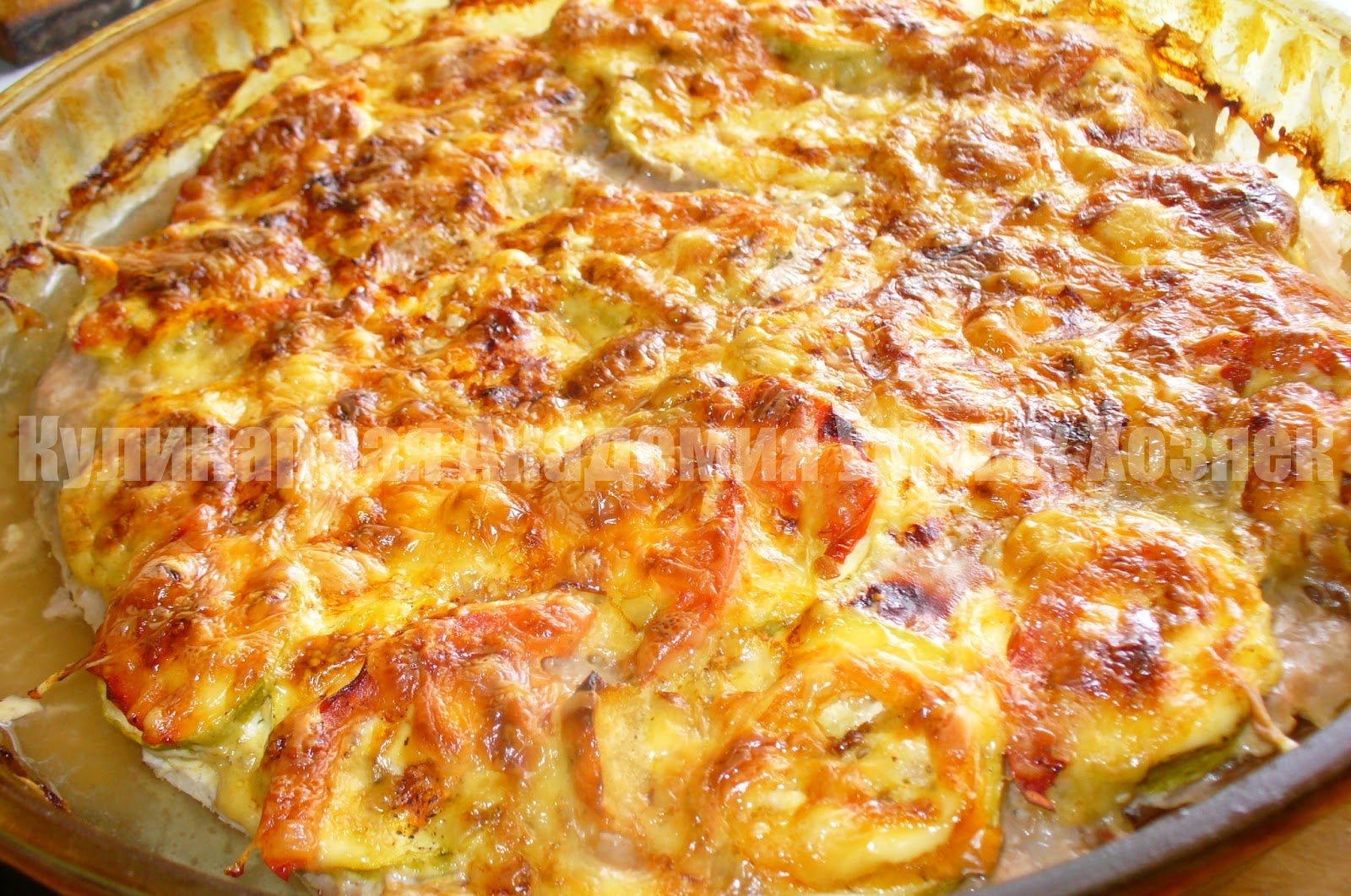 Отваренный остывший картофель очищаем, нарезаем кружочками, выкладываем поверх мяса с луком. Сверху посыпаем все крупно натертым твердым сыром. Дополнительно поверхность блюда можно смазать остатками маринада.