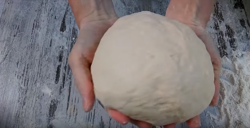 - Когда масса станет довольно густой, начать разминать ее руками, подсыпая, при необходимости, муку. Замес должен быть быстрым – не более 5 минут, это не дрожжевое тесто, которое любит тепло рук. После этого собрать массу, положить под пленку и дать отдохнуть 5-10 минут. Готово!
