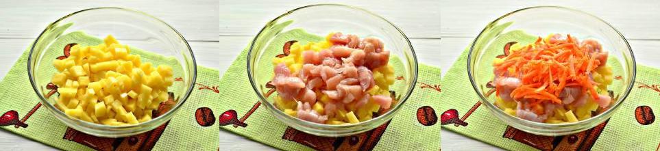 3. Курятину рубим в фарш. Лук мелко шинкуем. Картофель нарезаем миниатюрными кубиками (по 1 см.). Соединяем эти ингредиенты. Солим их, перчим и тщательно все составляющие смешиваем.