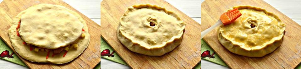 - Накрываем собранный курник оставшимся пластом из теста. Залепляем края.