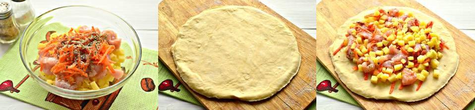 Раскатываем круг толщиной примерно 0.4-0.5 мм, кладём на нашу форму с нахлёстом на края, идёт первый слой начинки-курочка, и при этом стараемся, чтоб по краям начинки было меньше, а в серединке побольше, чтоб в конечном итоге наш курник имел красивую высокую форму в форме горки.
