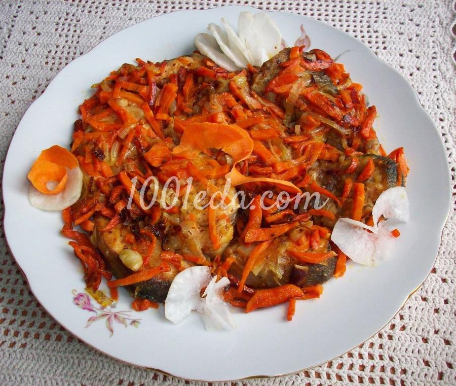 - В форму для запекания или противень выложите кусочки рыбы и обжаренный лук с морковью и залейте небольшим количеством маринада. Поставьте все в разогретую до 180 градусов духовку.