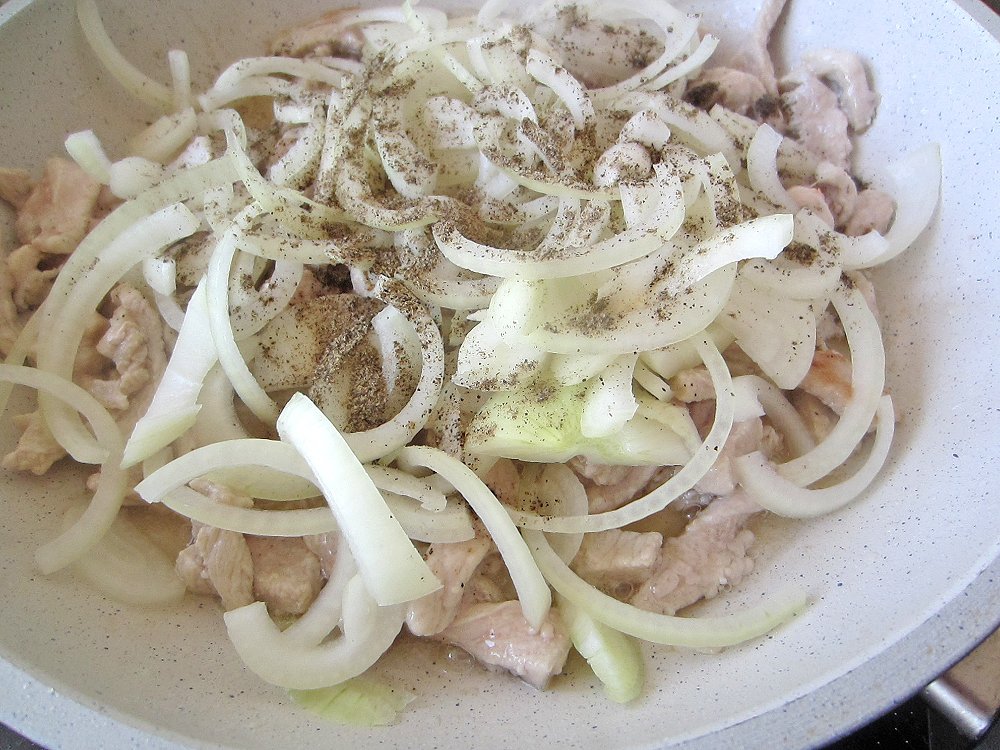 Обжариваем свинину с двух сторон буквально пару минут до белого цвета. Когда она побелеет, добавляем лук и посыпаем черным молотым перцем и обжариваем еще 5 минут.