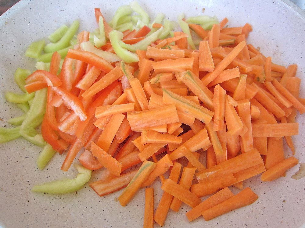 Параллельно ставим разогревать еще одну сковороду с совсем небольшим количеством масла. Перец нарезаем соломкой (если он будет разноцветным, получится более красочно, но можно использовать и перец только одного цвета) и отправляем обжариваться на сковороду вместе с морковкой. У меня в этот раз зеленый и оранжевый перец — последний почти слился с морковкой :))