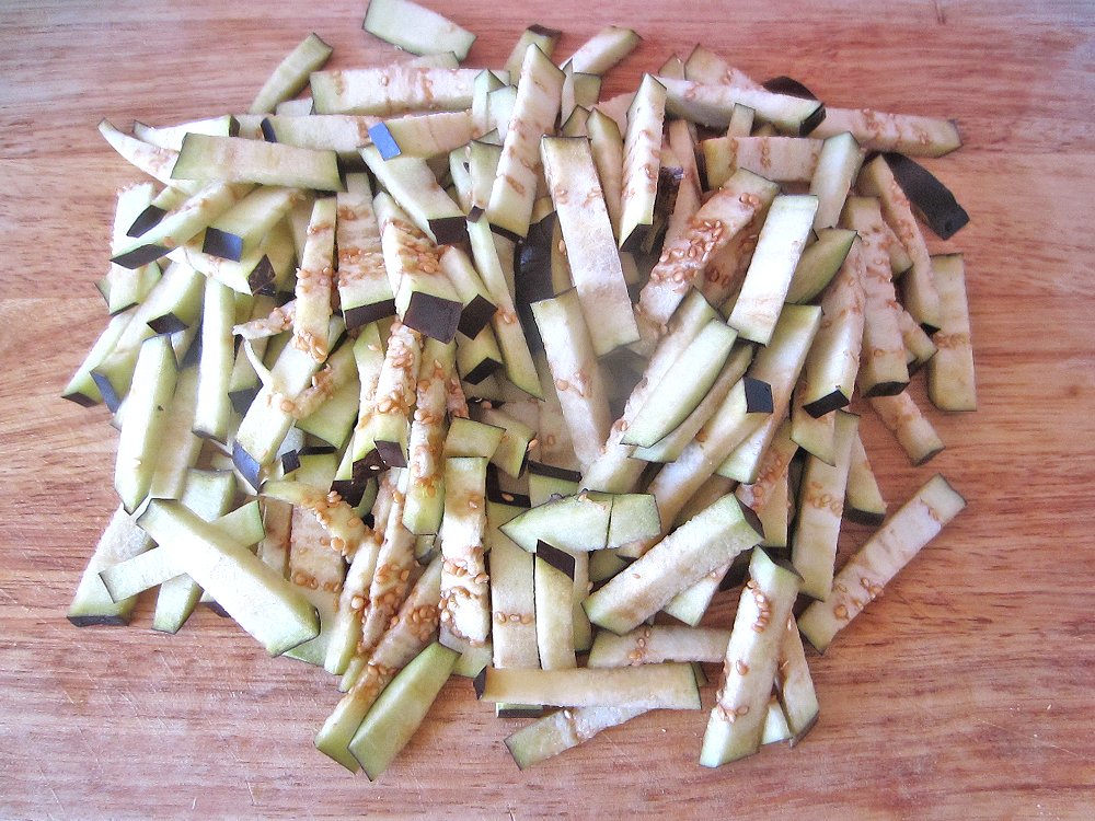 - С баклажанов очень тонко снимите кожицу и нарежьте брусочками. Сбрызните соевым соусом и присыпьте крахмалом, а затем перемешайте, чтобы он равномерно распределился.