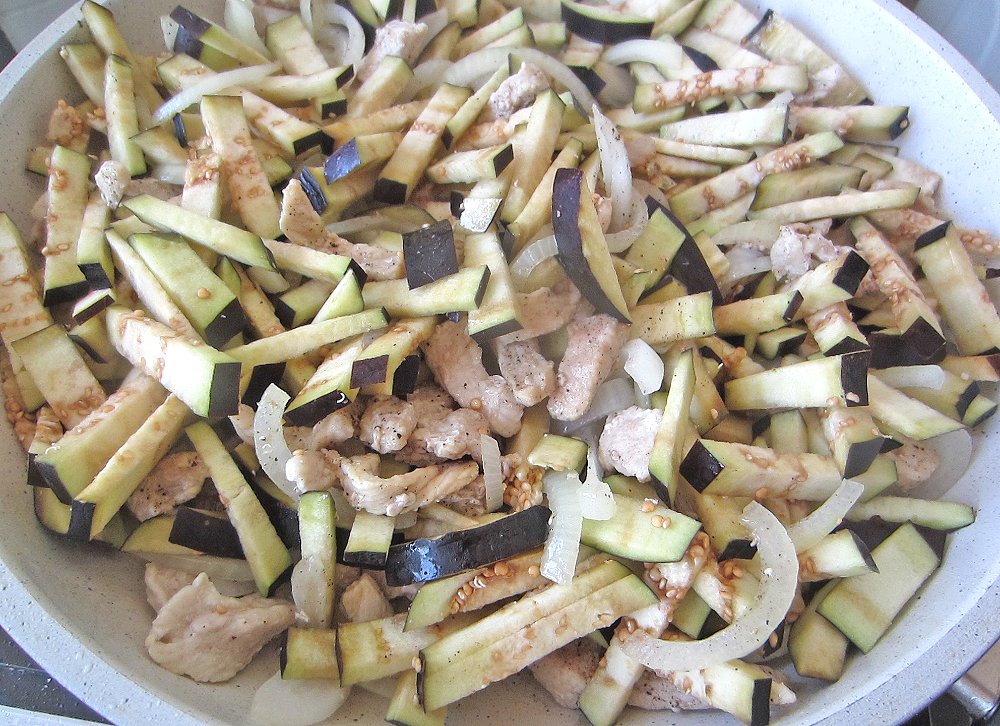 На медленном огне тушите свинину с луком при периодическом помешивании около 10 минут. Теперь настал черед баклажанов. Выложите их на сковороду к мясу.