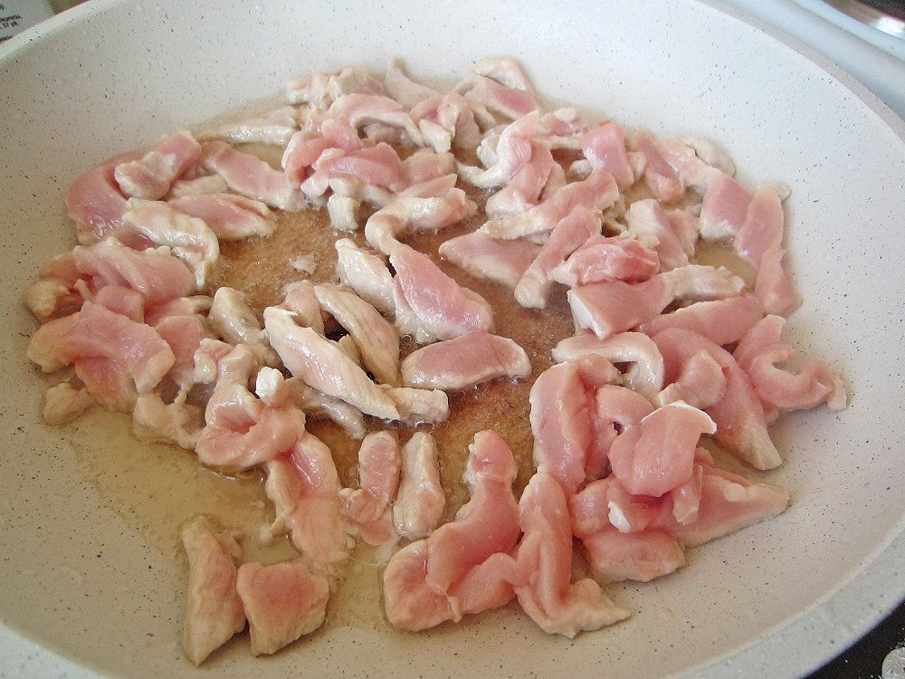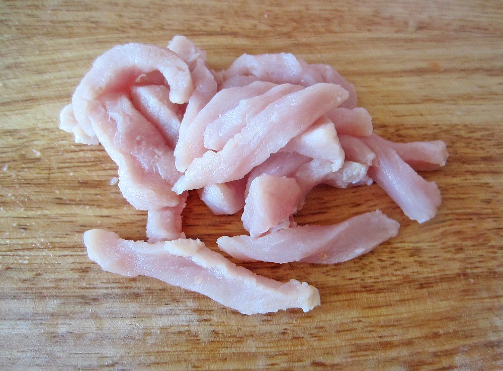- Нарежьте свинину брусочками. Добавьте яичные белки и половину порции соевого соуса. Перемешайте и дайте мясу промариноваться минут 15–20.