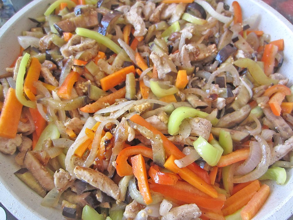 Отправляем баклажаны к мясу, перемешиваем и обжариваем на среднем огне до потемнения — разумеется, до потемнения баклажанов, а не мяса И не забываем помешивать наши перец с морковкой — как только овощи подзолотятся, снимаем их с огня.