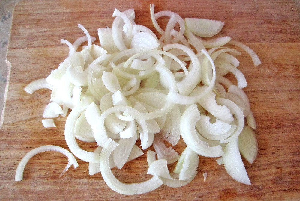 Лука нужно достаточно много: две крупные головки или три средние. Тонко нарезаем полукольцами и разъединяем их.