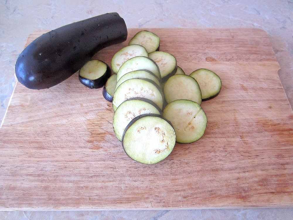 Начнем с баклажанов: режем их тонкими (примерно 0,5 см) кружочками. Затем натираем их небольшим количеством соли, отправляем в глубокую миску и заливаем водой.