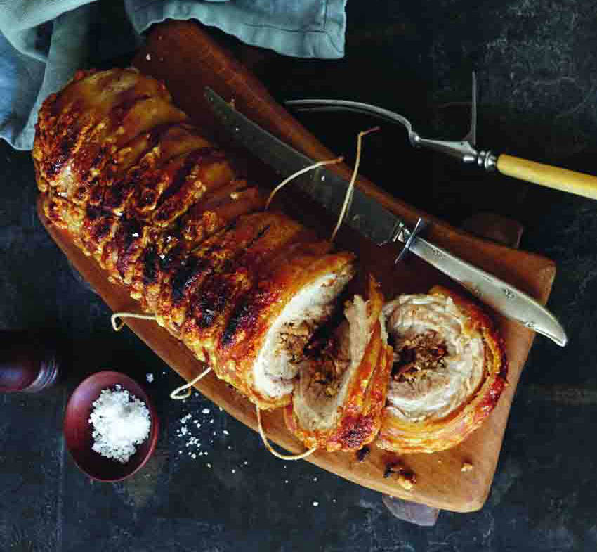 Для такого варианта сытной закуски можно взять брюшину со шкуркой. Она должна быть тонкая, мягкая и хорошо выскобленная. Подпеченная в духовке шкурка станет еще мягче и покроется аппетитной румяностью, а желатин, которым она так богата, поможет зафиксировать рулетную форму угощения.