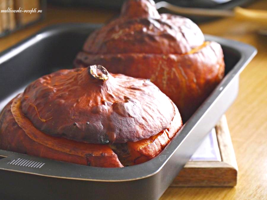 - Накрыть тыквенной крышкой, поставить в сковороду или любую другую форму, отправить в духовку, разогретую до 180°C, на 1 – 1,5 часа в зависимости от размера тыквы.