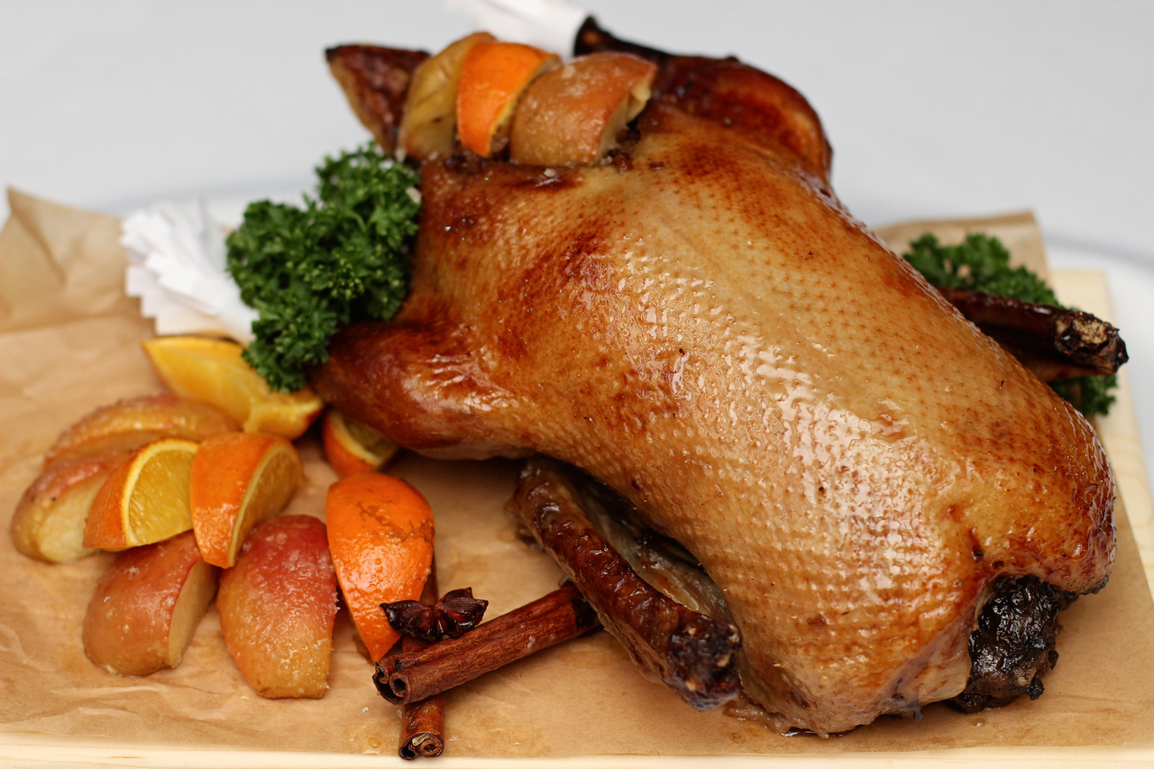Запеченная утка фаршированная рисом, яблокам и апельсином