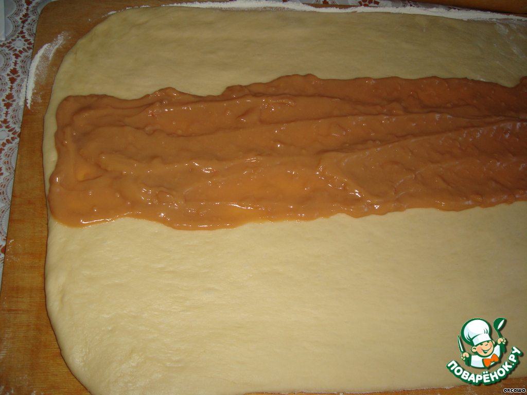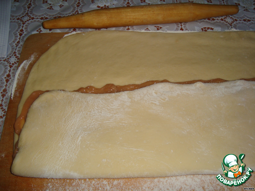 5. После чего тесто разделите на два куска, и каждый кусочек раскатайте в тонкий пластик толщиной 1-1,5 см, выложите начинку. Сверните далее каждый лист в рулет и порежьте ножом на части. Край каждой булочки защипите, чтобы он не разомкнулся.
