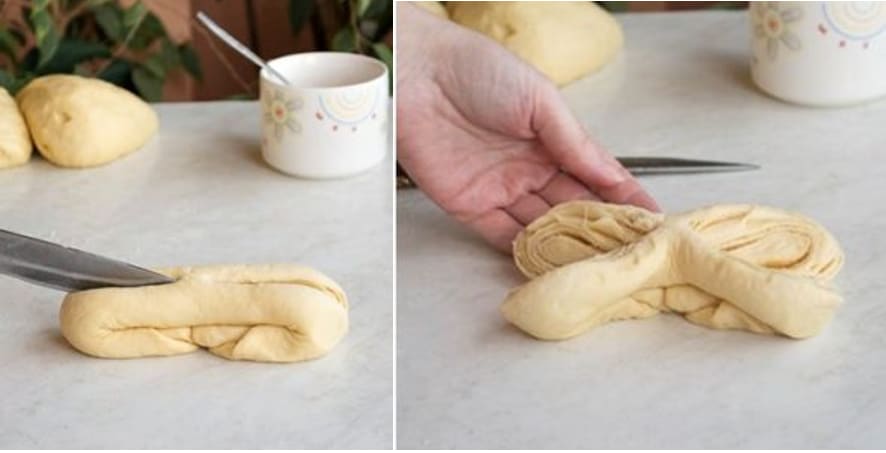 7. Когда оно увеличится в объеме в два раза, скатать его в жгут и разделить на 18 — 20 равных кусочков. В этот раз мы сделаем булочки в виде узелочков.