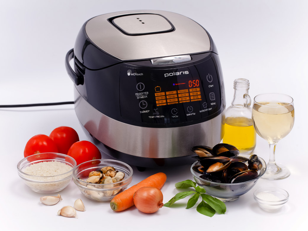 - В чашу прибора влить масло и выставить режим «Жарка». Когда продукт прогреется поместить мидии. Потомить 5 минут, при этом постоянно перемешивая силиконовой лопаточкой.