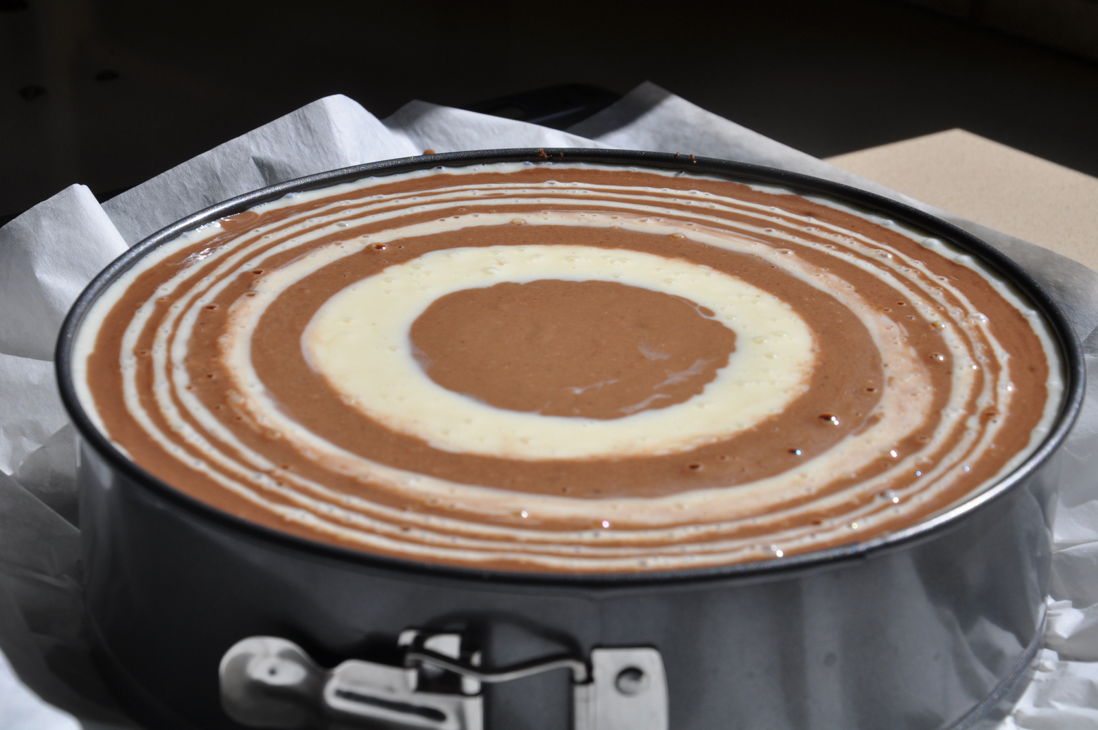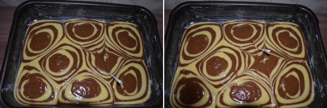 16. В случае, если верх пирога уже пропечется, а середина еще нет — следует накрыть пирог фольгой, уменьшить температуру до 160 градусов и выпекать пирог «Зебра» до готовности.