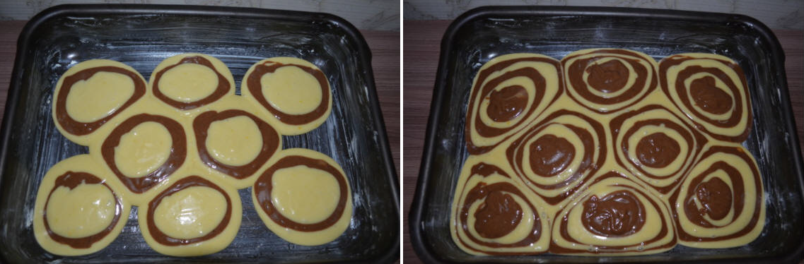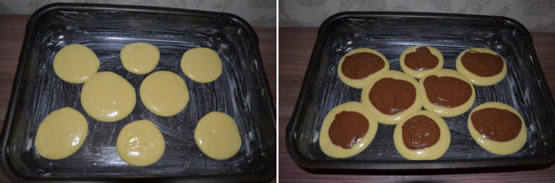 Первым делом необходимо смазать форму растительным маслом. Выкладывать тесто следует в центр, всегда стараться выливать его в одну точку. Сначала взять 2 ст. ложки светлого теста и поместить его в центр формы. Затем поверх него, так же в центр выложить 2 ст. ложки темного. Далее снова чередовать светлую и темную массу.