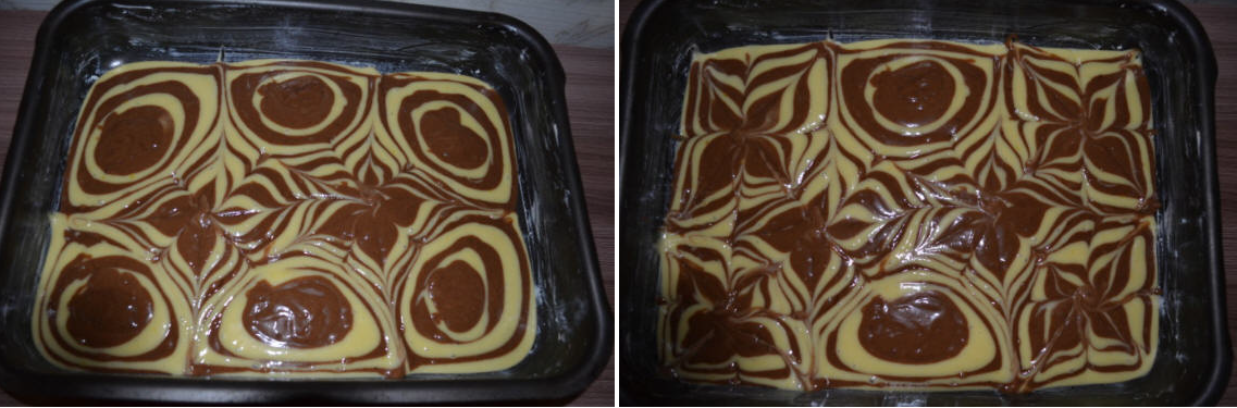 - Чередовать шоколадные и творожные слои, пока не выльете все тесто.
