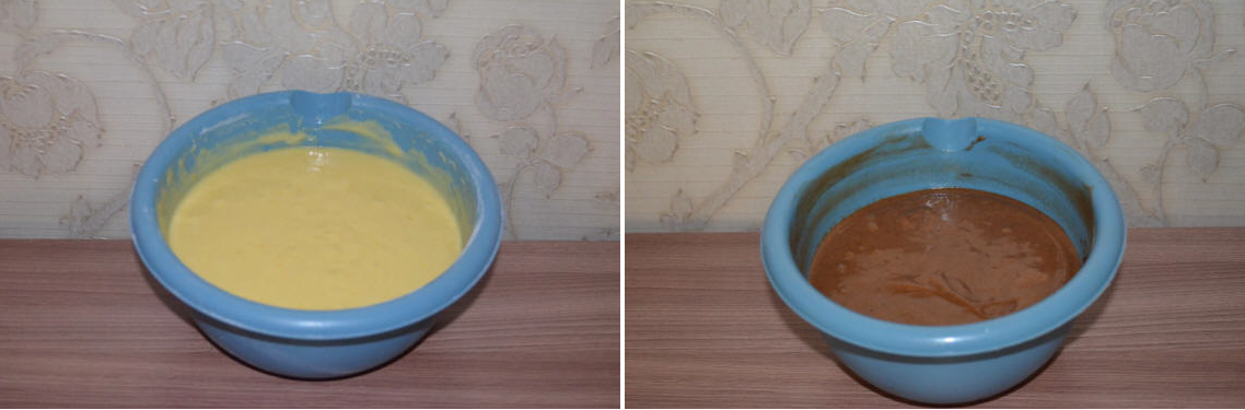 При это в темную часть муку добавлять не надо, так как какао является само неким загустителем. По окончании замеса, масса должна получиться по консистенции похожей на густую сметану.